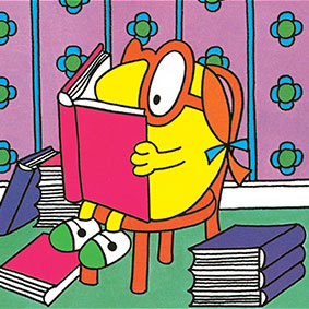 Is never seen without her big red glasses
